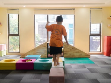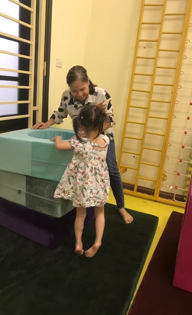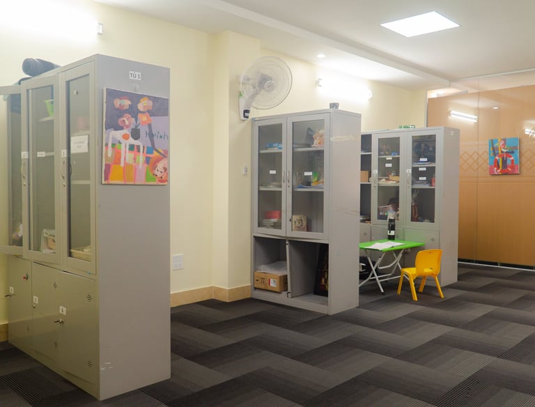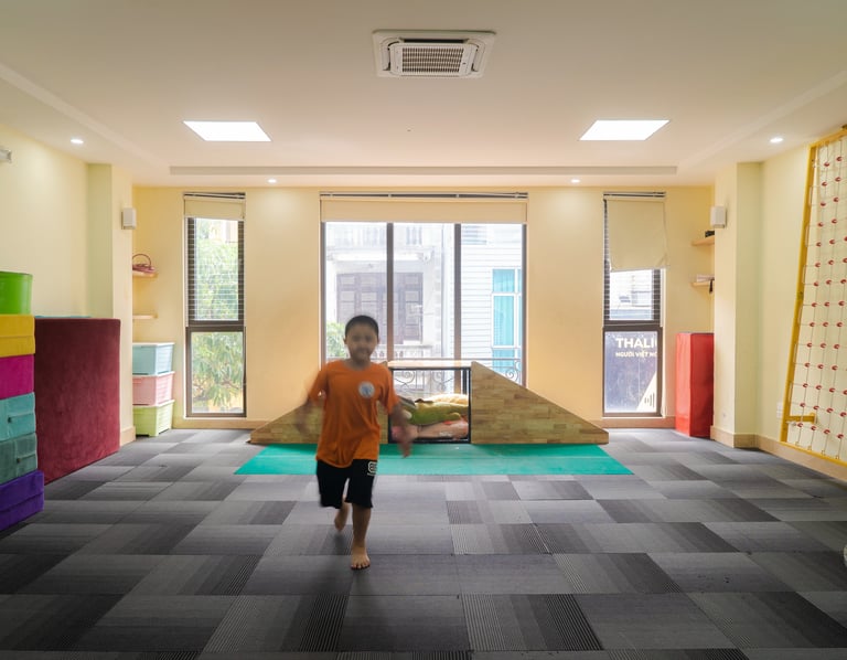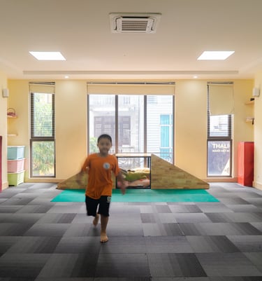 Ban lãnh đạo trung tâm chúng tôi không ngừng cố gắng hoàn thiện, bổ sung các phương pháp can thiệp mới. Để đáp ứng nhu cầu đó, hiện tại phòng Tâm Vận Động Aucouturier sẽ chính thức được thành lập và đưa vào hoạt động phục vụ công tác trị liệu cho trẻ. Chúng tôi vinh dự là 1 trong 4 phòng tâm vận động tại Hà Nội với chuyên gia tâm vận động được đào tạo theo chương trình của nước ngoài liên tục trong vòng 3 năm. Nhằm đảm bảo an toàn cho các bạn học sinh, trung tâm đã làm hệ thống rào chắn tại các cầu thang và ban công, thang máy có khóa thẻ từ. Bên cạnh đó, trung tâm còn sử dụng nhiều tranh và sản phẩm handmade do chính các học sinh làm ra để trưng bày và trang trí, tạo không gian thân thiện và gần gũi. Qua đó, các bậc phụ huynh thấy được quá trình học tập và sự tiến bộ của con mình từng ngày.